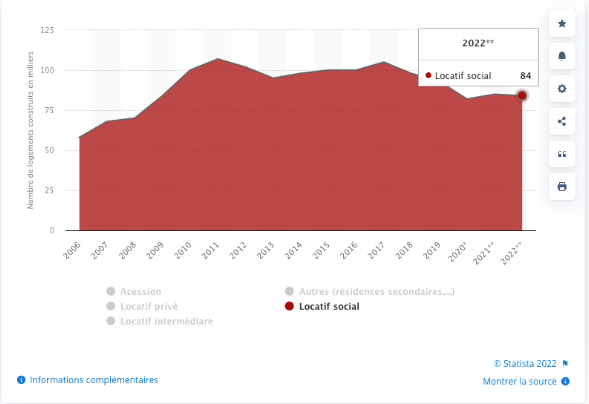 Tous les candidats à la présidentielle ou presque avaient proposé la construction d’un certain nombre de logements sociaux. Marine Le Pen n’échappe pas à cette règle et propose la construction de 100 000 nouveaux logements sociaux par an dont 20 000 en faveur des étudiants et des jeunes travailleurs. La projection du nombre de logements sociaux construits en 2022 est de 84 000 nouveaux logements. La proposition de la candidate R.N. est de retrouver le niveau de production de 2018, année durant laquelle 105 000 logements sociaux avaient été construits.