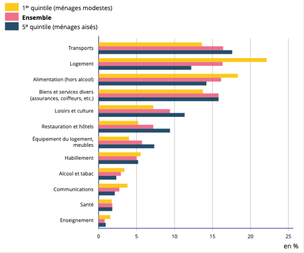 Sur l’ensemble des ménages, le logement représente 16,3% des dépenses. Il est d’autant plus important pour les ménages les plus modestes ou il représente 22,3 % des dépenses loin devant l’alimentation avec 18,3% des dépenses.